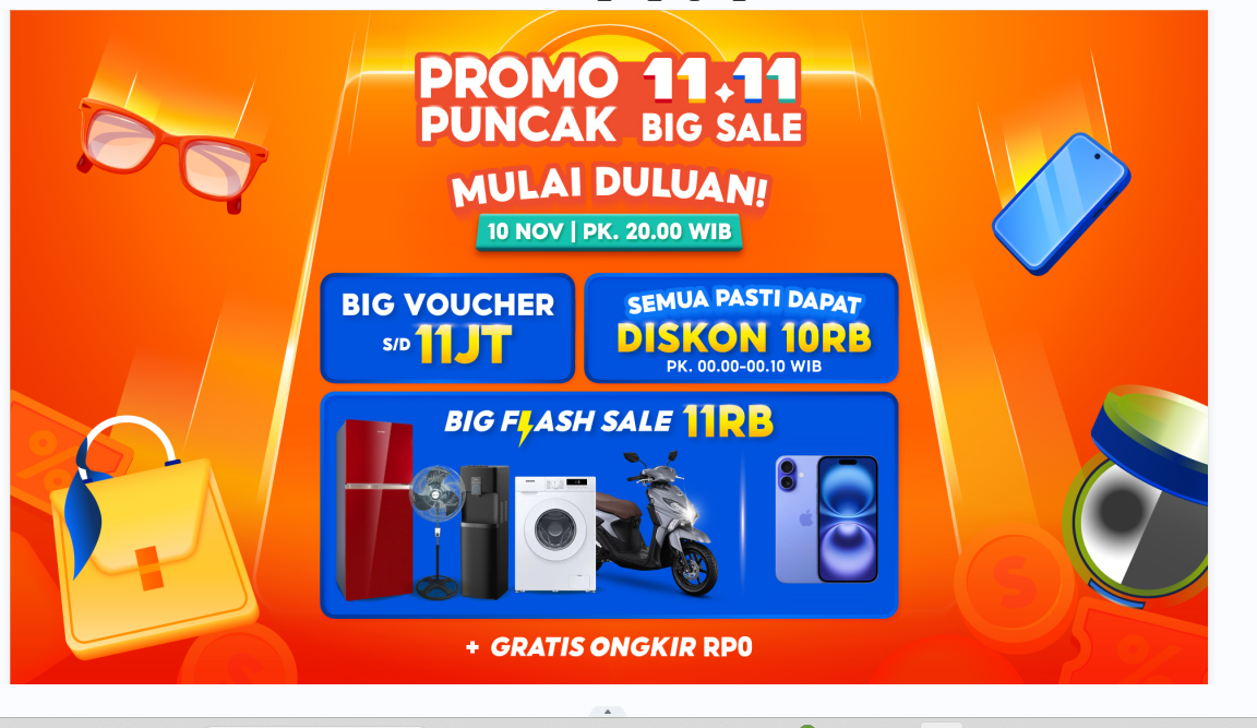 Puncak kampanye pada 11 November mendatang akan menghadirkan rangkaian promo spesial dan berbagai kejutan menarik, seperti Flash Sale 100 Motor, Semua Pasti Dapat Diskon 10RB, Big Voucher s/d 11 JT, hingga Gratis Ongkir Rp0.
