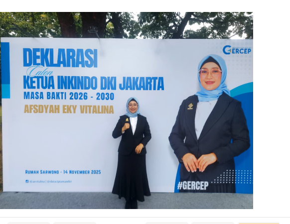 “Tantangan INKINDO DKI Jakarta ke depan cukup besar, untuk itu pengelolaan DPP INKINDO DKI Jakarta tidak bisa dilakukan secara “business as usual”, tetapi memerlukan pemikiran yang inovatif, adaptif, dan diterminasi kepemimpinan dalam pelaksanaan program organisasi yang bersifat kompleks dan multi disiplin. Agar eksistensi INKINDO DKI Jakarta sebagai barometer DPP INKINDO seluruh Indonesia dapat terus dikembangkan, maka diperlukan kepemimpinan DPP INKINDO DKI Jakarta yang visioner, profesional, adaptif, berintegritas dan memiliki rekam jejak panjang dalam mencapai tujuan organisasi yang ditetapkan dalam Musyawarah Provinsi (Musprov),” demikian dikatakan Afsdyah Eky Vitalina, S.P., M.Si, Sekretaris DPP INKINDO DKI Jakarta dalam acara Deklarasi Calon Ketua DPP INKINDO DKI Jakarta Masa Bakti 2026-2030 atas nama dirinya di Rumah Sarwono, Pasar Minggu, Jakarta Selatan.