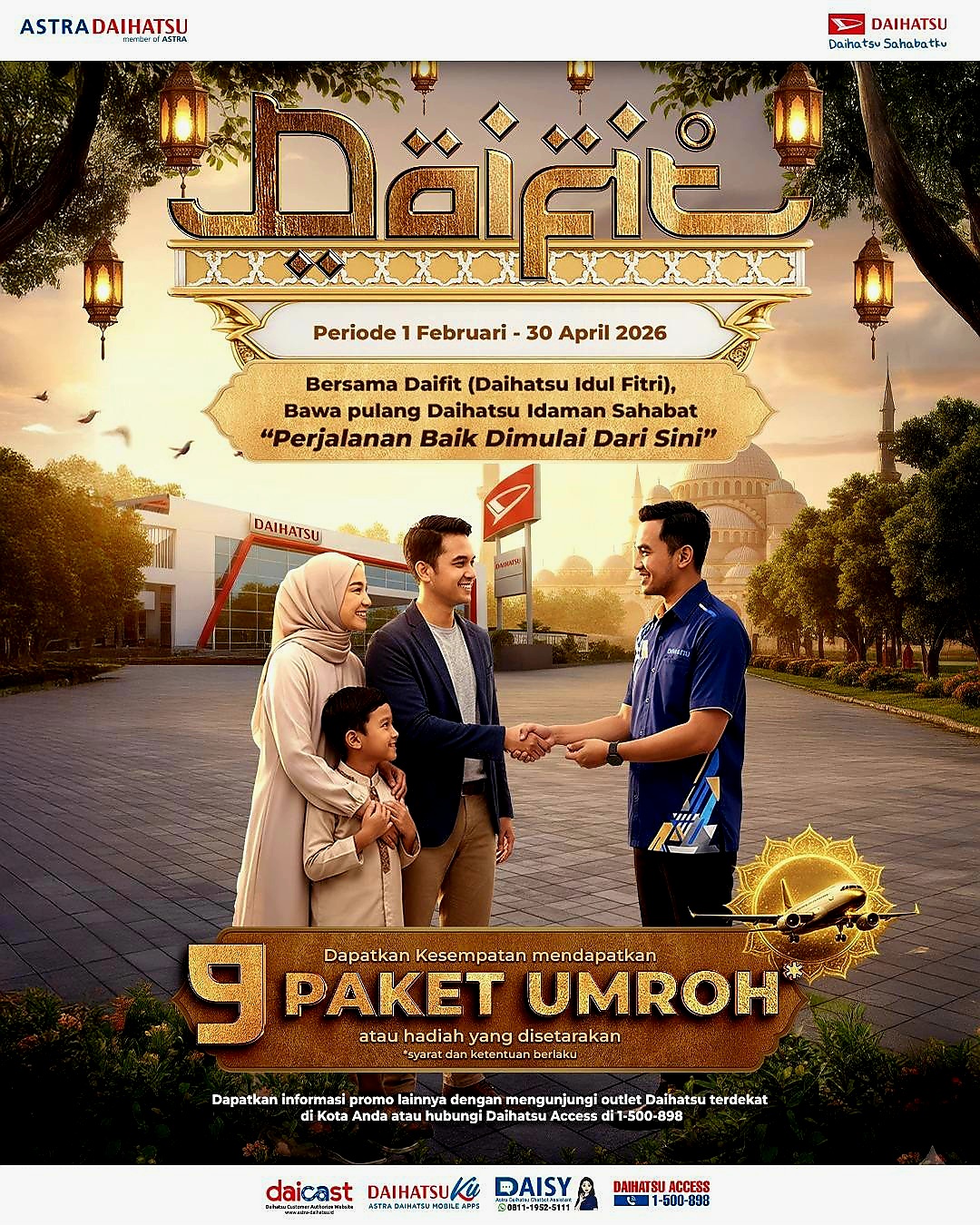 Businessasia.co.id – Astra Daihatsu kembali menghadirkan program DAIFIT (Daihatsu Idul Fitri) yang berlaku untuk pembelian kendaraan Daihatsu selama periode 1 Februari – 30 April 2026. Memasuki tahun ke-4 penyelenggaraannya, DAIFIT menjadi wujud komitmen Daihatsu dalam memberikan kemudahan bagi masyarakat Indonesia untuk memiliki mobil, sekaligus menghadirkan kesempatan berharga berupa hadiah perjalanan umroh untuk 9 orang pemenang.