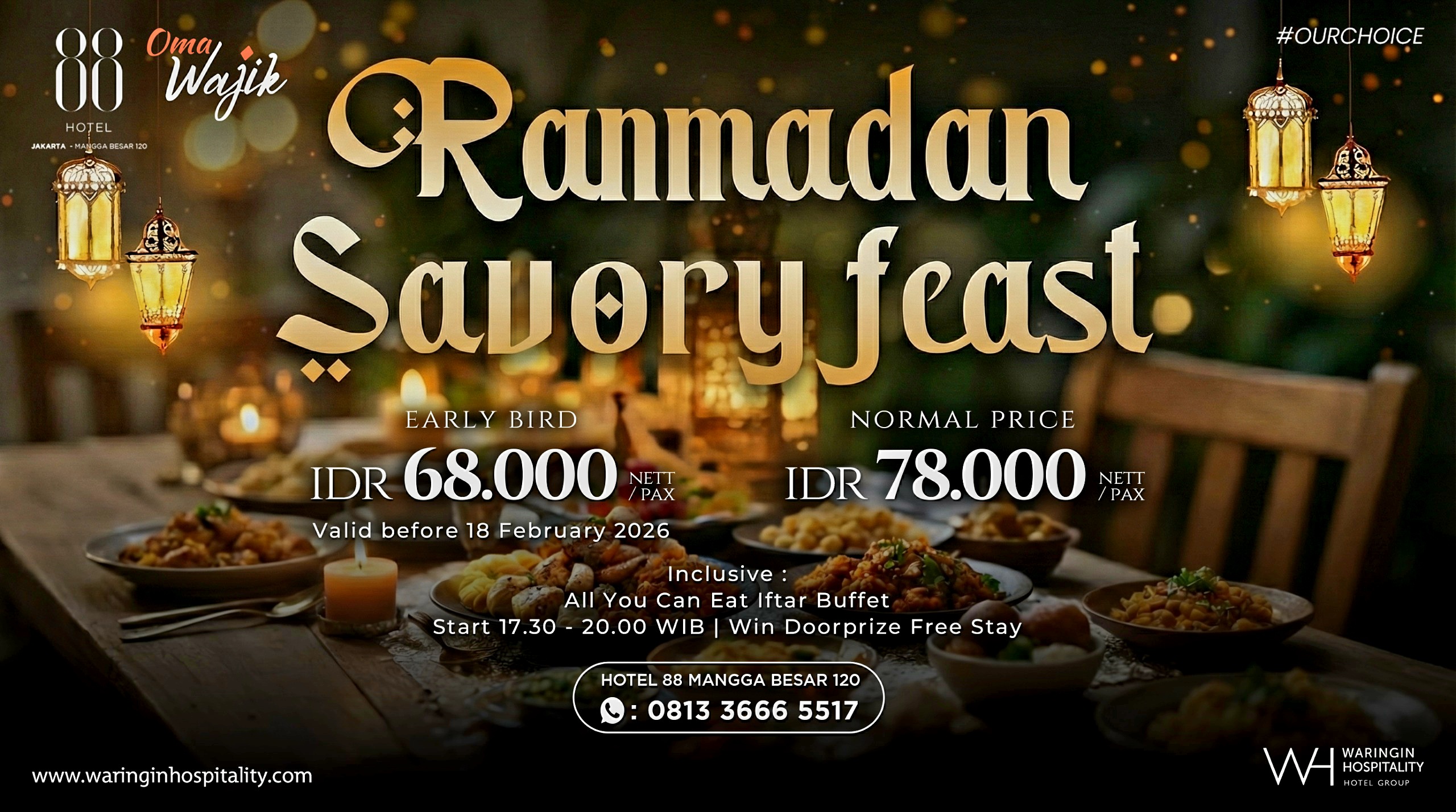 Berlokasi di Oma Wajik Resto, Hotel 88 Mangga Besar 120, promo ini mengusung konsep All You Can Eat Iftar Buffet dengan beragam pilihan menu tradisional Indonesia yang disajikan khusus untuk menemani momen berbuka puasa bersama keluarga, sahabat, maupun rekan kerja.