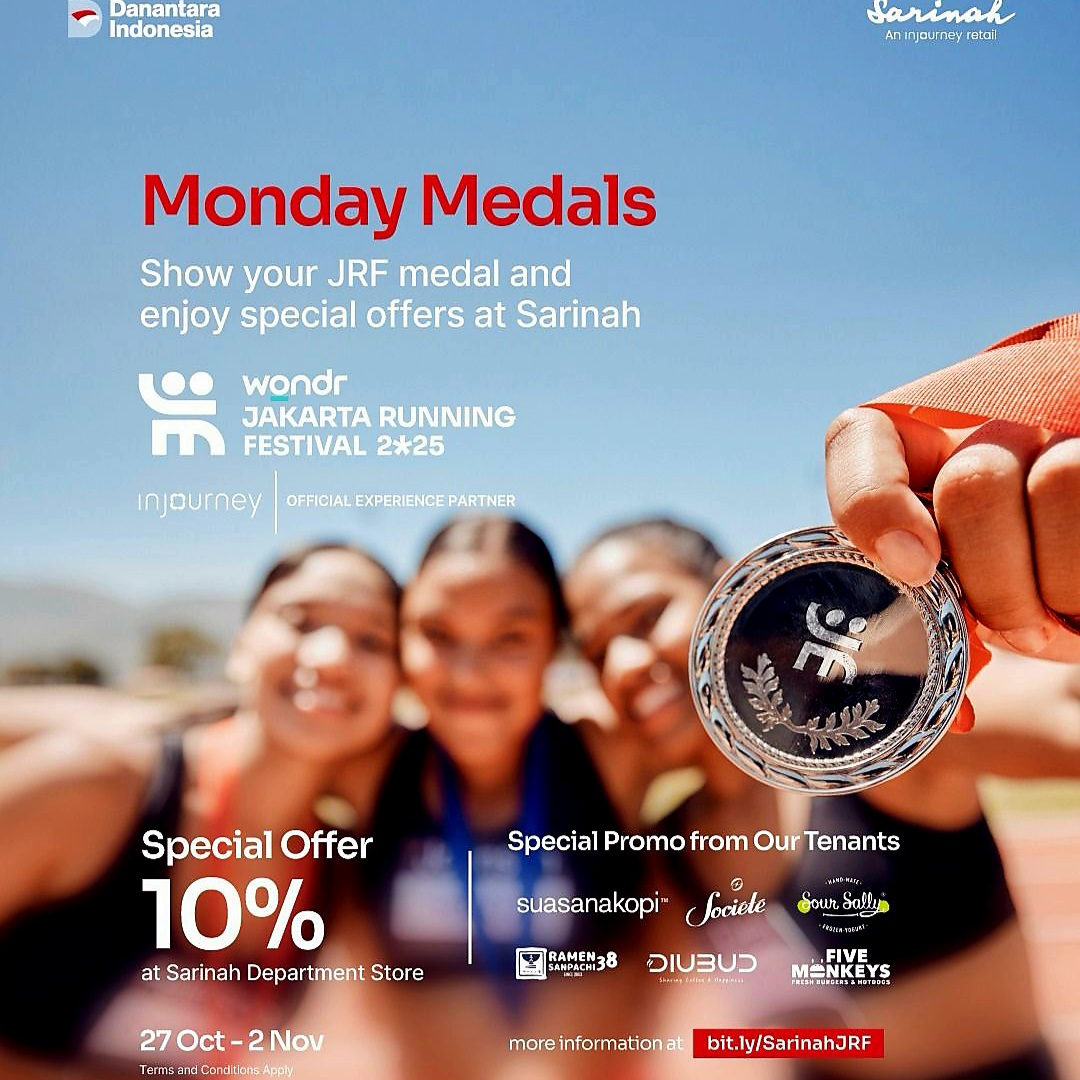 Lebih dari sekadar promo, “Medal Monday” menghadirkan pengalaman otentik khas Jakarta yang hanya bisa ditemukan di Sarinah. Para pelari dapat bersantai menikmati secangkir kopi lokal di Suasana Kopi dan Diubud serta mencicipi hidangan kuliner modern di Societe dan Five Monkey Selain itu, Sarinah juga berpartisipasi di Race Village wondr JRF 2025 pada tanggal 23-25 Oktober 2025 di Istora Senayan melalui booth yang menampilkan berbagai produk