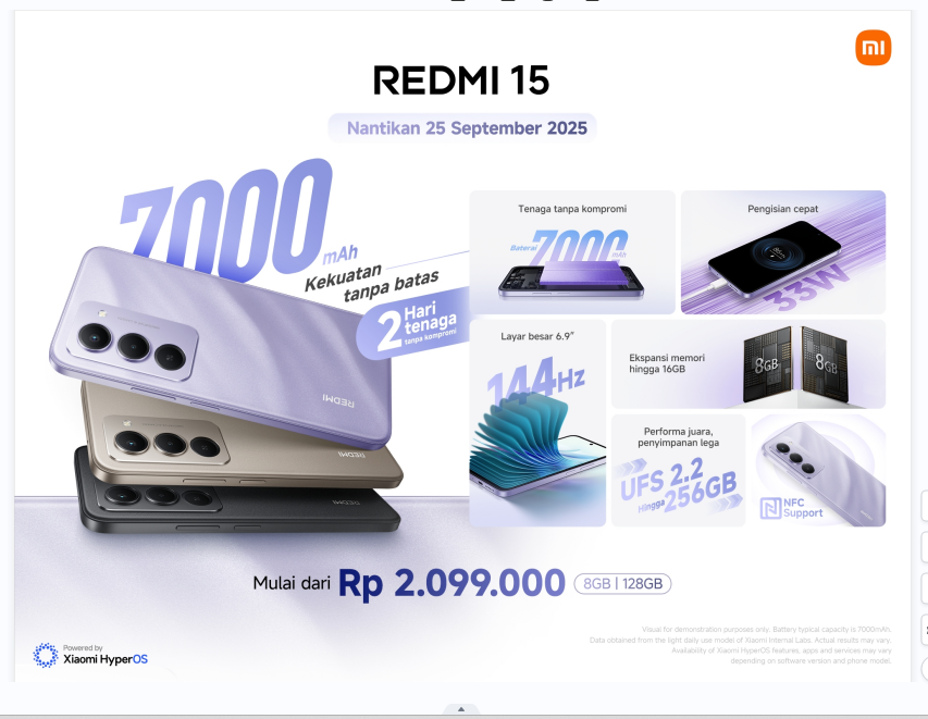 Dengan slogan “Kekuatan Tanpa Batas”, REDMI 15 hadir sebagai smartphone yang #AlwaysReady buat generasi muda Indonesia yang aktif, serba cepat, dan selalu terhubung.