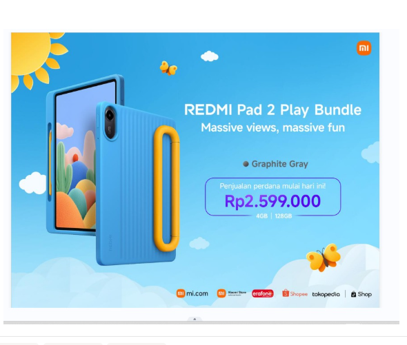 REDMI Pad 2 Play Bundle bisa didapatkan dengan harga Rp2.599.000. Temukan produk ini di seluruh kanal penjualan resmi Xiaomi Indonesia, termasuk Xiaomi Store, Mi.com, Tokopedia, Shopee, TikTok Shop, dan Erafone.