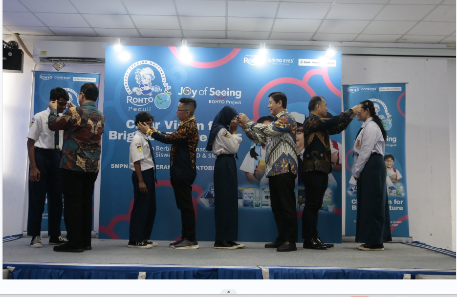 Secara simbolis acara ROHTO Peduli 2025 membagikan 1.200 kacamata gratis dilakukan di SMPN 32 Tangerang dengan dihadiri oleh Bpk. Mukdaya Massidy President Director PT Rohto Laboratories Indonesia, Emmah Suhainah, S. Pd Kepala Sekolah SMPN 32 Tangerang, Bpk. Purnama Sidi Djajaprawira President Director CV Anugrah Surya Metta (Optik Good Eyes), Mr. Eiichiro Sakai Vice President Director PT Bank Resona Perdania.