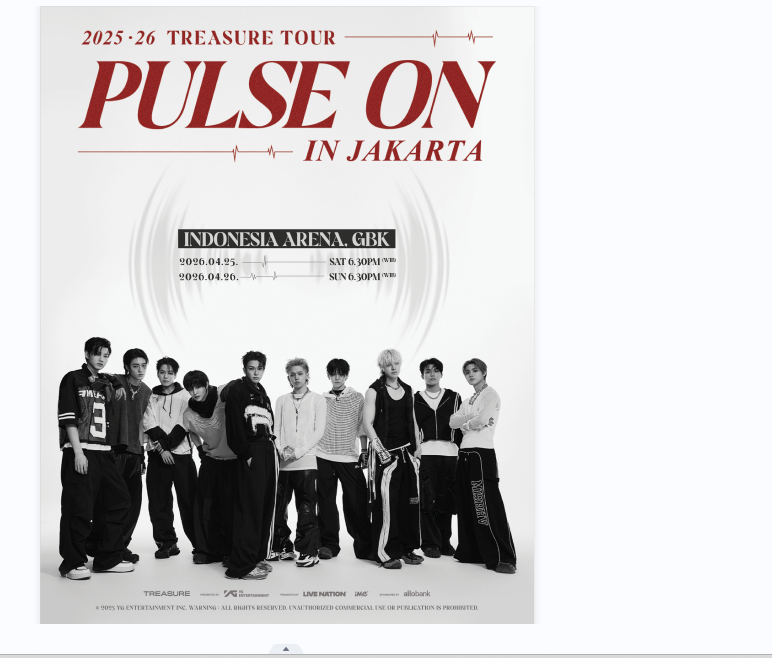 Konser bertajuk TREASURE TOUR [PULSE ON] IN JAKARTA 2026 yang dipromotori oleh iMe Indonesia ini dijadwalkan berlangsung selama dua hari, yaitu pada 25 dan 26 April 2026 di Indonesia Arena, Gelora Bung Karno, Jakarta.