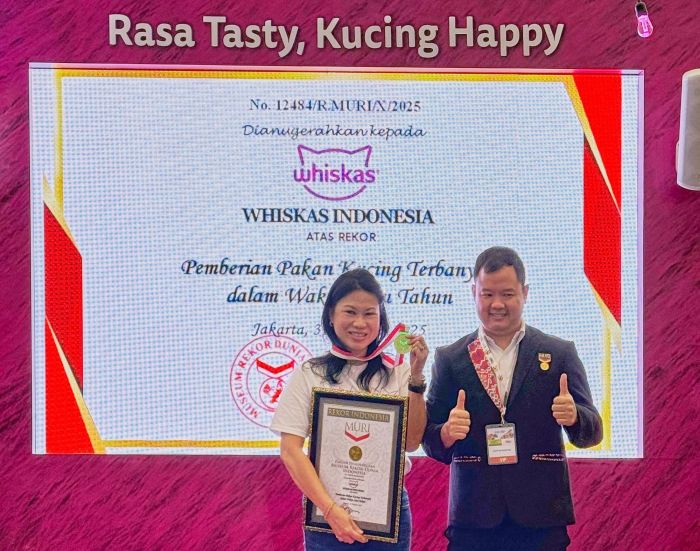 BSD City, Businessasia.co.id — Merek WHISKAS® di Indonesia mencatat prestasi dengan meraih pengakuan dari Museum Rekor-Dunia Indonesia (MURI) untuk kategori “Pemberian Pakan Kucing Terbanyak dalam Waktu Satu Tahun”. Rekor ini didasarkan pada data Mars Petcare mengenai jumlah sampel WHISKAS® Pouch yang didistribusikan melalui program pembagian sampel secara nasional antara bulan Januari 2024 hingga Januari 2025. Prestasi ini meruakan pengakuan atas komitmen berkelanjutan WHISKAS® dalam menyediakan nutrisi berkualitas yang terjangkau dan disesuaikan untuk setiap tahapan hidup kucing.Mengingat kucing memiliki kebutuhan biologis dan nutrisi yang unik dan berbeda dari manusia, maka memberi mereka makanan rumahan dapat memiliki dampak kekurangan nutrisi. WHISKAS® secara konsisten menyarankan pemberian nutrisi kucing yang lengkap dan seimbang, agar setiap kucing memperoleh asupan yang benar-benar mereka butuhkan untuk bisa tumbuh sehat.