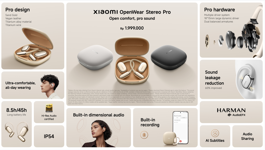 Xiaomi OpenWear Stereo Pro hadir dalam pilihan warna Black, Gray, dan Gold, yang ditawarkan dengan value Rp1.999.000.