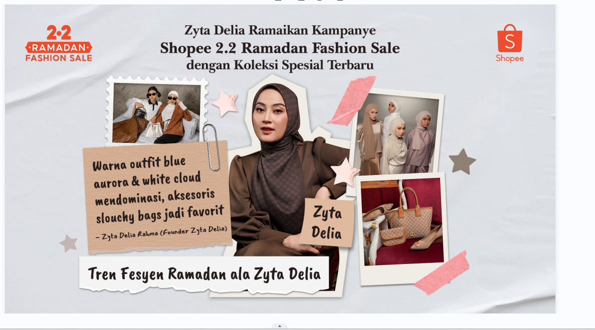 Melalui kampanye Shopee 2.2 Ramadan Fashion Sale yang berlangsung sejak 25 Januari hingga 3 Februari, brand besutan Zyta Delia Rahma meluncurkan ragam koleksi fesyen dan aksesoris terbaru yang dirancang untuk menemani berbagai momen pengguna selama Ramadan.